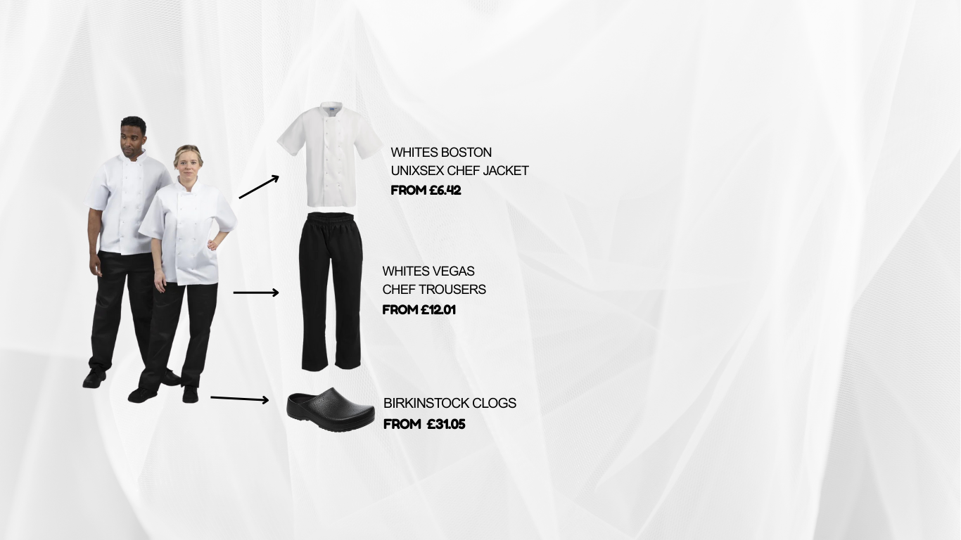 Complete your kitchen uniform with trusted Whites chef jackets and trousers, paired with supportive Birkenstock clogs. Designed for comfort, durability, and performance in busy professional kitchens.