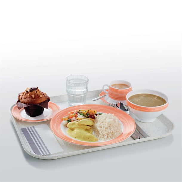 Arcoroc Brush bowls stand out with their distinctive design, featuring broad coloured "brush strokes" around the rim that contrast with the white surface of the bowl. This use of colour is especially practical in healthcare environments, where it can help with food zoning or identifying different dietary requirements.