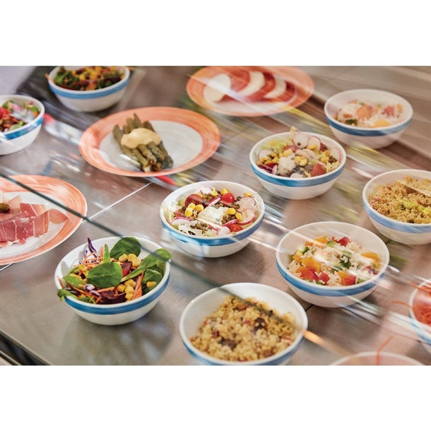 Arcoroc Brush dessert plates stand out with their distinctive design, featuring broad coloured "brush strokes" around the rim that contrast with the white surface of the plate. This use of colour is especially practical in healthcare environments, where it can help with food zoning or identifying different dietary requirements.