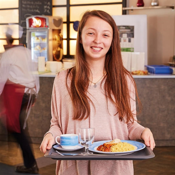 Arcoroc Brush plates stand out with their distinctive design, featuring broad coloured "brush strokes" around the rim that contrast with the white surface of the plate. This use of colour is especially practical in healthcare environments, where it can help with food zoning or identifying different dietary requirements.