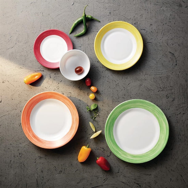 Arcoroc Brush plates stand out with their distinctive design, featuring broad coloured "brush strokes" around the rim that contrast with the white surface of the plate. This use of colour is especially practical in healthcare environments, where it can help with food zoning or identifying different dietary requirements.