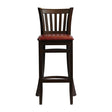 The Manhattan bar chair is the perfect height to pair with a poseur table, drinking shelf or right there in front of the pumps. Made to contract furniture standard, its solid wood construction ensures sturdiness and longevity, allowing the chair to withstand the demands of commercial environments. Its distinctive curved back with vertical slats offers a touch of traditional flair while providing excellent lumbar support. A bison bordeaux fabric covers the padded seat, adding a layer of both comfort and sophistication.