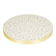 Measuring 600mm in diameter, this Bolero round table top boasts a vibrant terrazzo print design complemented by a premium brass-effect edge in aluminium film. It comes pre-drilled to fit Bolero table bases and is stain and scratch resistant for lasting use. For convenience, the surface of the table easily wipes clean, saving you time both before and after service.