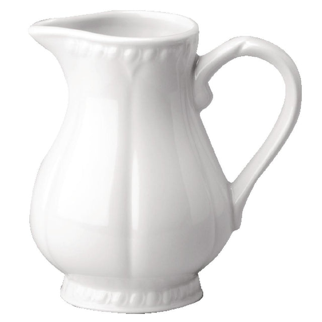 Buckingham white jugs have a distinctive rope embossed Gadroon edge and subtle fluting, perfect for any catering establishment looking for a more traditional style of tableware. Its super vitrified body has a high resistance to thermal shock which helps reduce breakages.