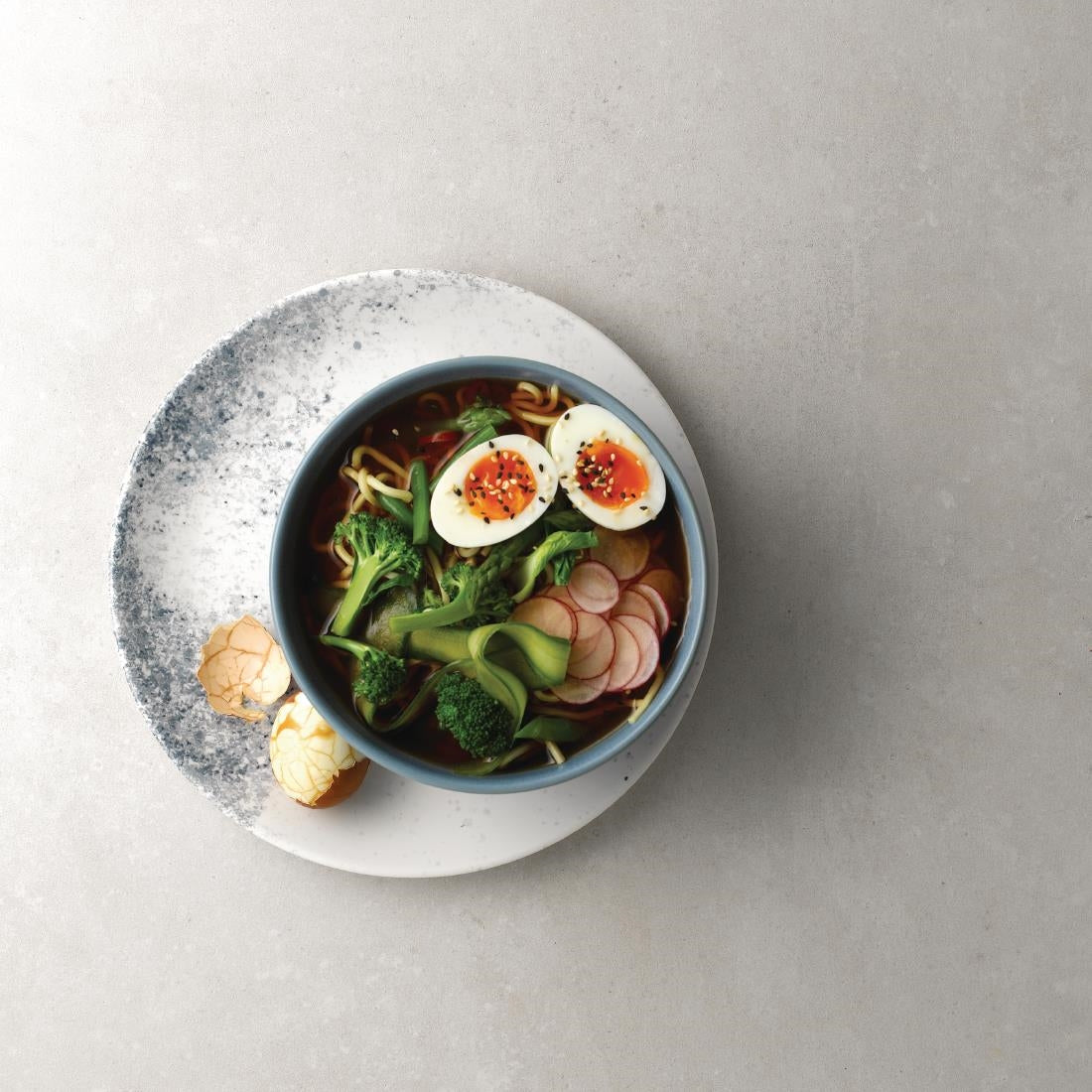 The Haze design features a multi-tonal pattern inspired by the process of spraying glaze onto ceramics in Churchill's semi matte Vellum finish.