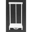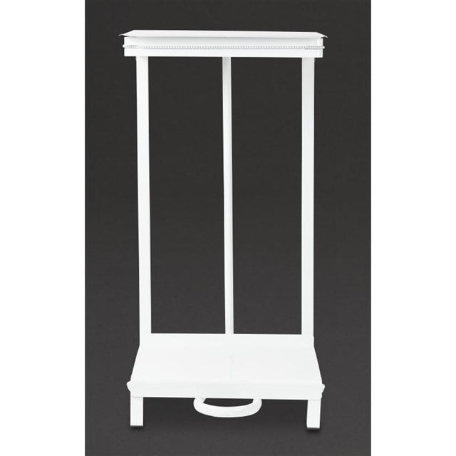 Free-standing pedal operated sack holders in white painted steel. There is a foot control pedal which opens the lid for hygienic hands free use.
