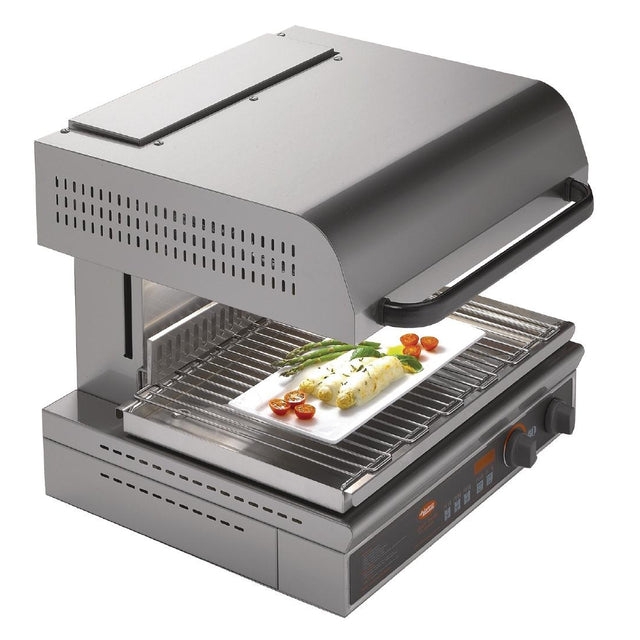 This wall-mounted or bench-mounted Hatco Salamander electric grill has a sophisticated plate detection system which heats up in 8 seconds and switches off when not in use. Upper cover adjusts from 70mm to 185mm to suit your cooking needs and there are variable heat controls to manage the three separate heat elements.