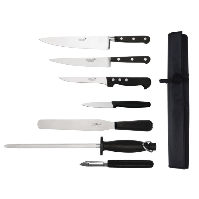 - Includes cook's knife, fillet knife, boning knife, parer knife, peeler, palette knife and sharpening steel