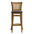 The Manhattan bar chair is the perfect height to pair with a poseur table, drinking shelf or right there in front of the pumps. Made to contract furniture standard, its solid wood construction ensures sturdiness and longevity, allowing the chair to withstand the demands of commercial environments. Its distinctive curved back with vertical slats offers a touch of traditional flair while providing excellent lumbar support. A shetland smoke fabric covers the padded seat, adding a layer of both comfort and sophistication.