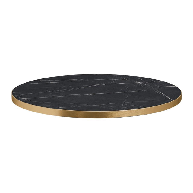 The perfect blend of style and durability, this Omega round laminate table top is a great choice for indoor areas with high contract use. Its striking black Carrara marble-effect laminate features a 2mm gold ABS edging which contrasts with the distinctive design of the top. Designed and manufactured for heavy use, the 25mm thick contract-grade laminate requires little maintenance and is easy to wipe and keep clean.