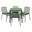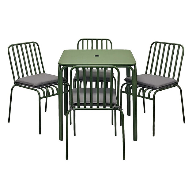 Outfit your outdoor space with this jade green metal dining set from Tenby. Built to endure with a contract-quality construction, it's perfect for high-traffic areas like pub gardens, cafe courtyards or restaurant patios. The set comprises a square dining table and four comfortable, stackable dining chairs with grey seat cushions. Its strong, rust-resistant powder-coated steel frame ensures it can withstand the elements, making it ideal for year-round use.