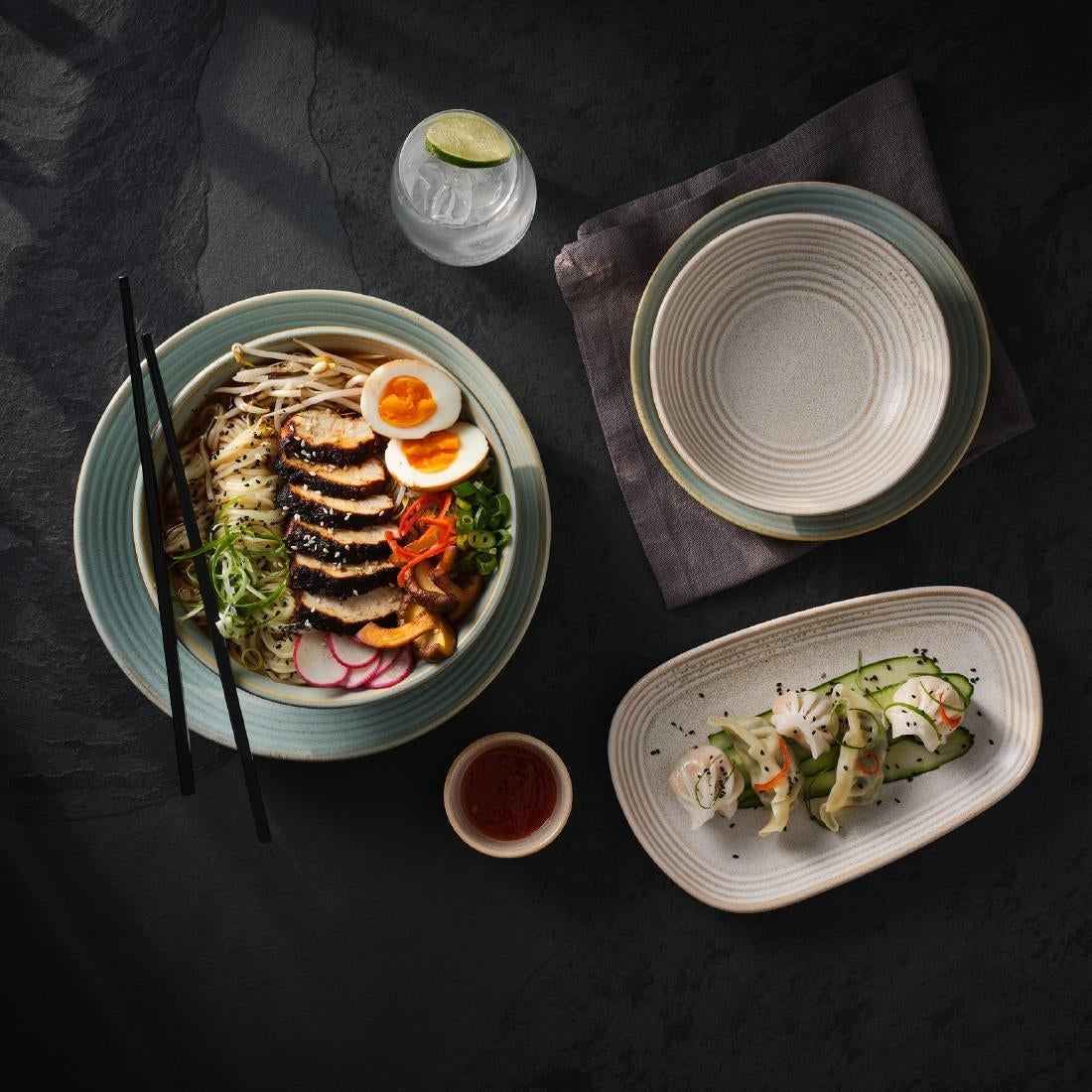 Terrace from Steelite by Folio brings together the look and feel of stoneware with the timeless appeal of a simple, tactile embossment. The range utilises semi-matt glazes which pool and interact with the embossed surface to give the impression of hand-worked, semi-precious stone. The embossment is carefully arranged to draw the eye to the centre of each piece, where the focus is on the food, framing it perfectly.