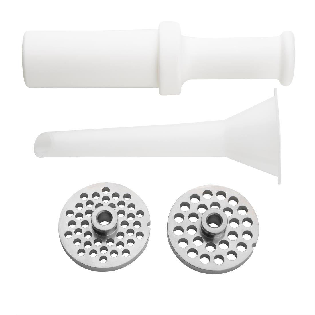 - Plastic pusher and sausage stuffing tube included