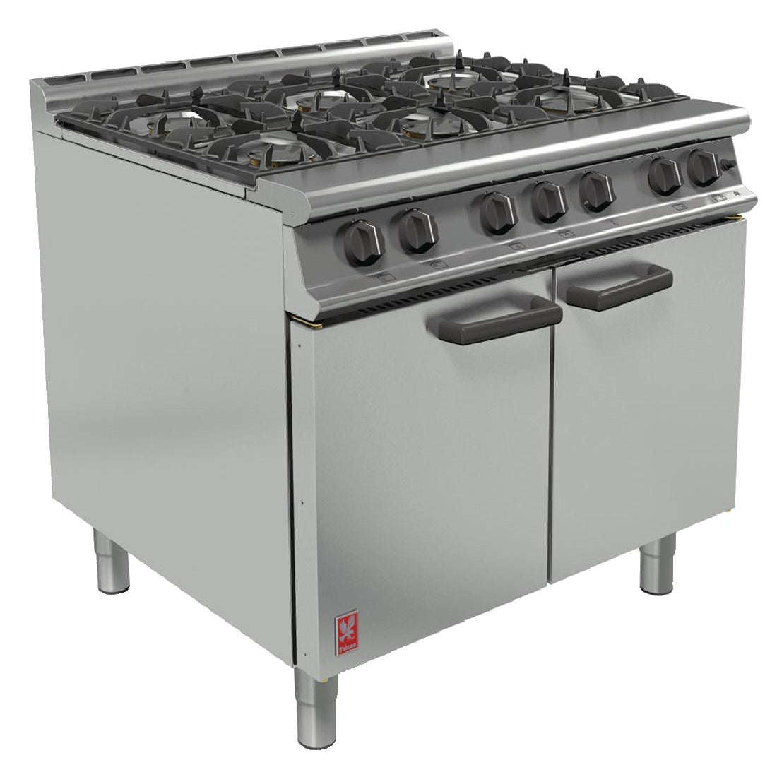A six burner Dominator Plus gas range from Falcon, featuring six high performance burners with cast iron pan supports and a general purpose oven. The removable stainless steel hob and vitreous enamelled gas oven chamber are both easy to clean, as well as to use. The wide temperature range and five shelf positions make the range extremely versatile, and the twin oven doors with individual catches helps retain heat increasing energy efficiency. The range also features laser etched control icons and low profile oven door handles for reduced intrusion into working space, and is 2/1 Gastronorm compatible.