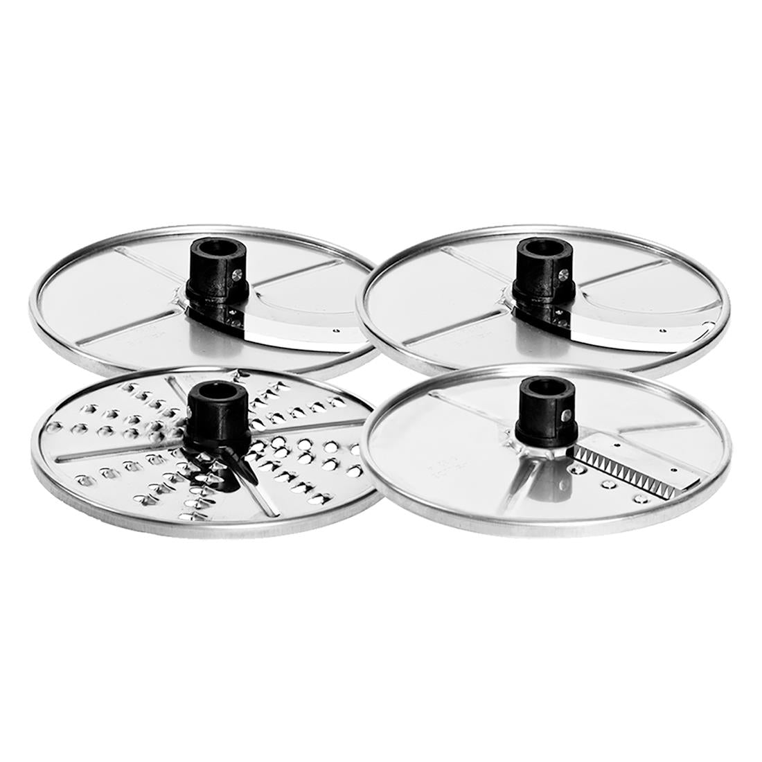 - Cutting discs included - 2mm slicer, 4mm slicer, 4mm grater/shredder, 2x2mm julienne cutter, 15x15mm dicing grid, 15mm soft slicer, 10x10mm dicing grid
