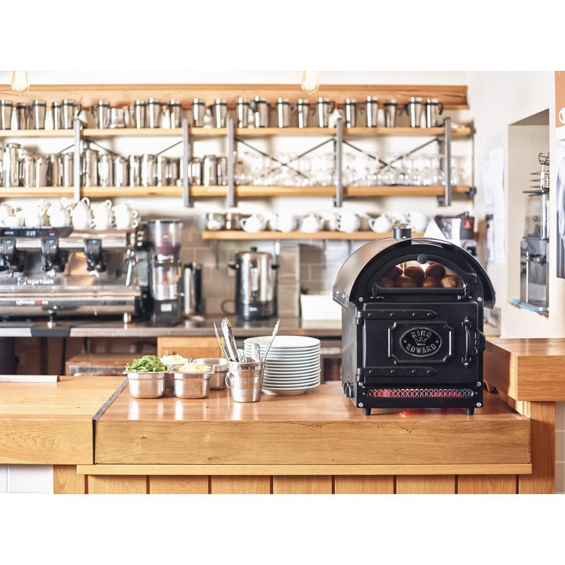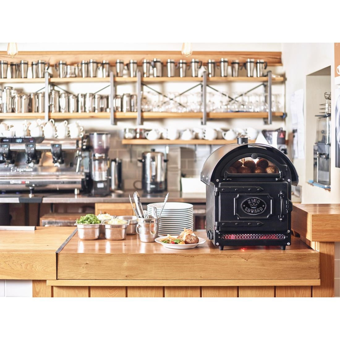 This small King Edward electric potato baker makes perfect baked potatoes, hot and ready to serve in approximately 55 minutes. It is a highly efficient and versatile convection oven which can also be used to cook other foods. Hand built with vitreous enamelled coloured panels, solid cast doors and stainless steel interior, the oven also illuminates the potatoes so you know when they are ready to be served.