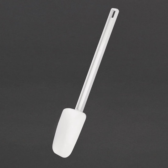 Rubber spoon shaped head mixes and folds. Strong hygienic handle.
