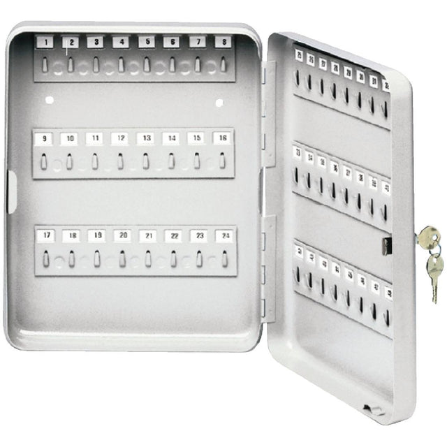 Lockable steel key box with capacity for 48 keys. Ready prepared for fixing to the wall, bolts supplied.