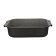 This large roasting tin with handles, is made of cast aluminium, and is strong and lightweight, with excellent heat distribution properties. The interior has two layers of scratch-proof non-stick coating for easy cleaning and food release.