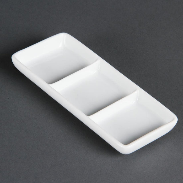 Great value pure white porcelain three section display dish for presenting food by Olympia, ideal for snacks and dips.