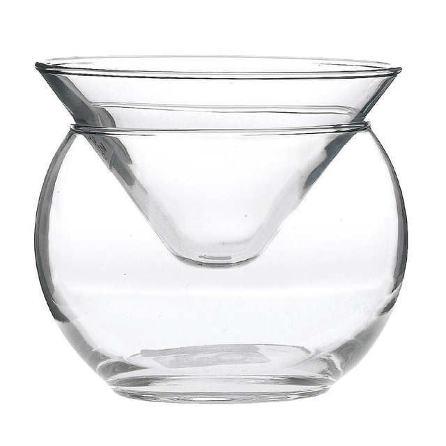 This sleek and stylish 2 piece item consists of a traditional martini shaped top without a stem and a chiller bowl. This unique item is the perfect way to keep your favourite cocktail cool, no matter how hot it gets. Not to forget, the thick glass bowl prevents ice from melting! It's a versatile performer. When you're not enjoying a martini, it seamlessly transitions into a stylish vessel for serving desserts or appetizers. Imagine presenting chilled fruit salads or delectable sorbets, in this chic chiller bowl.