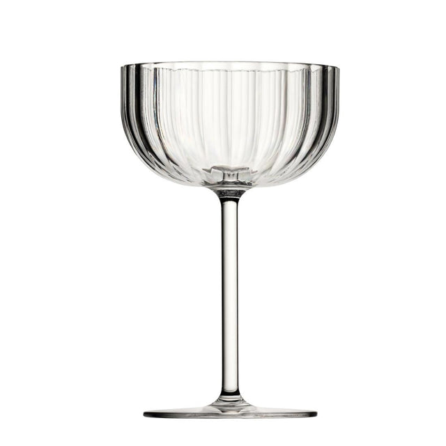 Crisp vertical optics and outstanding clarity make these Paradise coupe glasses stand out. Made from virtually unbreakable polycarbonate, the glasses have all the style of crystal glass but none of the fragility. This makes them the ideal choice for bars and restaurants where safety and durability are paramount. These Paradise coupe glasses are also glasswasher safe, allowing for quick and easy clean up after service.