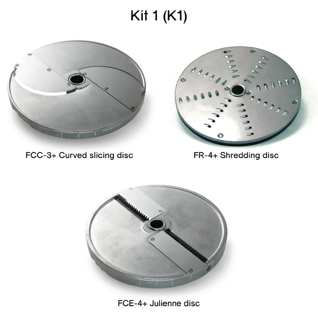 - Disc Kit 1 (-K1) includes 4mm Julienne Disc (FCE-4+), 4mm Shredding Disc (FR-4+), 3mm Curved Slicing Disc (FCC-3+)