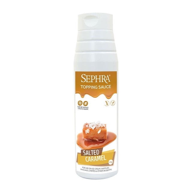 Elevate your desserts with Sephra's salted caramel topping sauce. Enjoy it warm or cold on ice cream, waffles, pancakes, crepes, and more. The convenient 1kg squeezable bottle with a non-drip cap and level indicator makes adding the perfect drizzle effortless. The resealable lid ensures freshness, and the sauce is suitable for both vegetarians and those following a gluten-free diet.