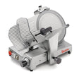 Heavy-duty gravity feed slicer with chromed steel blade and ventilated motor for reliable continuous use. Produces cuts up to 14mm thick. Supplied with standard blade removal tool. Non-slip feet for secure, stable placement.