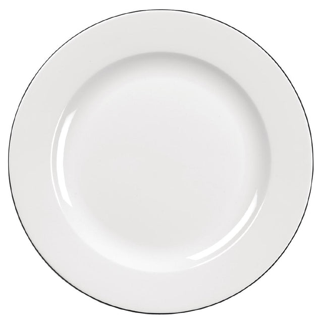 This white, fine china, 8" plate from the Mono collection by Churchill features a minimalist black line, making it ideal for any catering environment looking to provide a contemporary and striking crockery option. The Alchemy body of the plate has high thermal shock resistance and gives finer definition. Its superior glaze has been specially developed to resist erosion caused by dishwashing and resistant to the damage caused by cutlery. It also provides an ultra smooth surface for presentation whilst prolonging the life of the china.