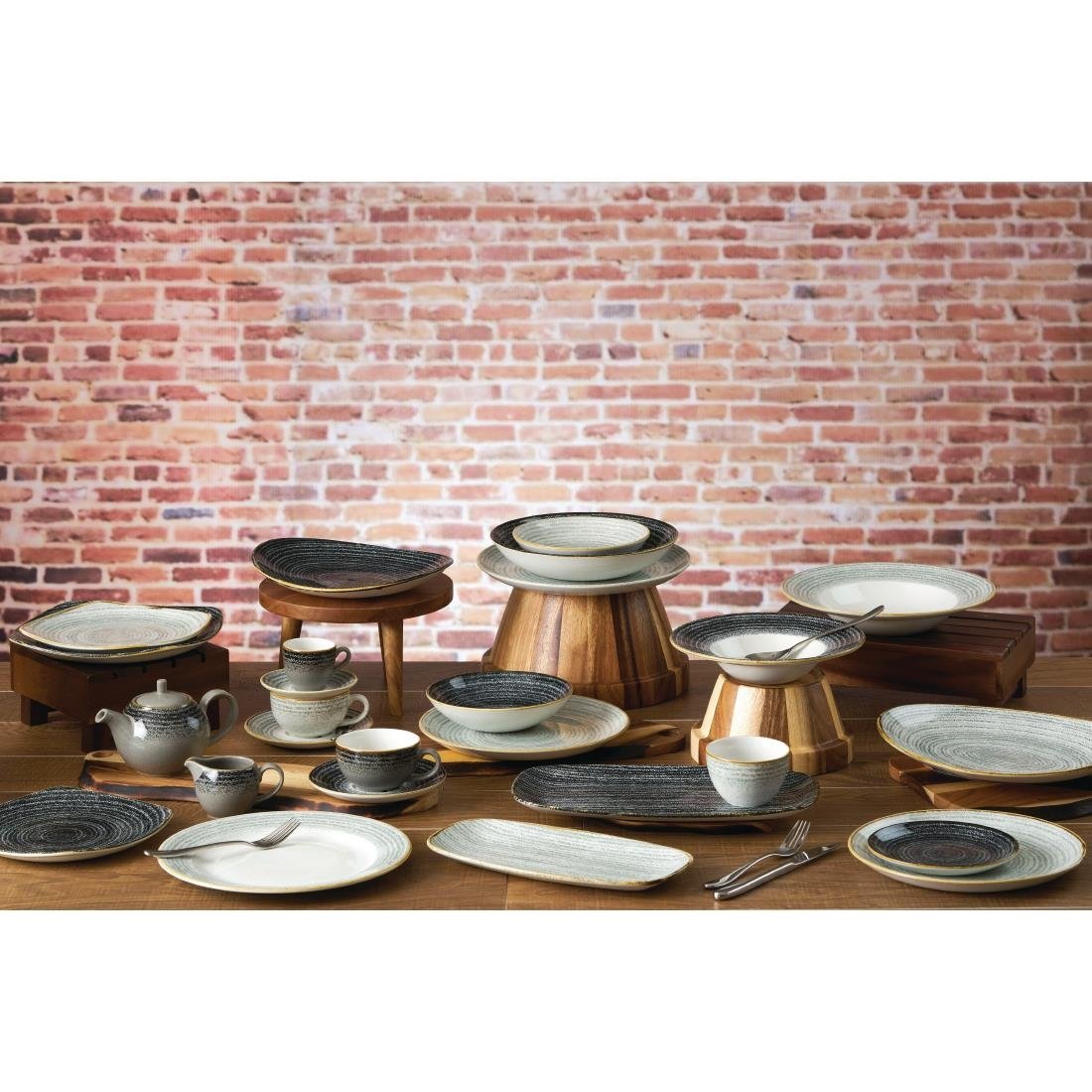 Studio Prints is an underglaze printed design finished with a hand applied edge band inspired by our archive Homespun designs, featured in the V&A Museum, London. With a look of homespun pottery, the range is available in two subtle colourways; Charcoal Black and Stone Grey. The range complements the latest food trends where fresh ingredients are showcased to stunning effect.